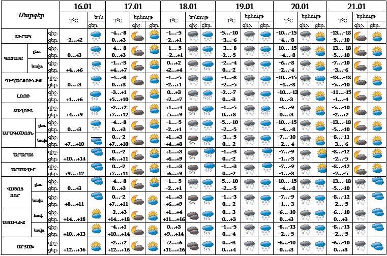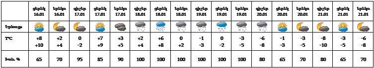 Հանրապետության տարածքում՝ հունվարի 16-ի ցերեկը, 20-ի ցերեկը, 21-ի գիշերն առանձին շրջաններում, 18-19-ը, 20-ի գիշերն ամենուրեք սպասվում են տեղումներ, լեռնային գոտում ձյան, նախալեռնային և հովտային գոտում թաց ձյան և ձնախառն անձրևի, իսկ 19-ին՝ ամենուրեք ձյան տեսքով: Հունվարի 17-ին, 21-ի ցերեկը սպասվում է առանց տեղումների եղանակ։Քամին՝ հարավային՝ 5-8մ /վ, առանձին վայրերում սպասվում է քամու ուժգնացում՝ 18-23 մ/վ:
